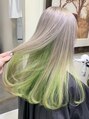 あんさんぶるスターズ!!の白鳥藍良くんと巴日和くんをイメージした推しカラーです!全体をブリーチ後、カラー剤でホワイトグレージュの下地を作った後にインナーにカラーバターで黄緑の色をプラスしているデザインです♪