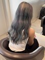 グレーベースに水色、紫のメッシュの入ったデザインカラーです。カラフルですが寒色系でまとめているのでガチャガチャせずお洒落な配色です。施術時間が通常のダブルカラーより1時間長くかかるためご希望の方はお電話にてご連絡頂けると当日スムーズです!