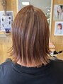 ギリギリ結べる長さできりっぱなしボブ。数回白髪染をやめて、白髪ぼかしをするためにブリーチなしのハイトーンで。黄色っぽく抜けやすい髪質の為、オレンジピンクをいれました。元々退色していたけど奇抜すぎずツヤもでて綺麗な色味が入りました。