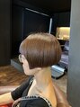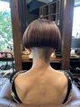 バックは0.8ミリで耳後ろまで刈り上げる、サイドはやや前下がりで耳たぶが見える長さ設定、必要に応じてすきを入れる。