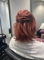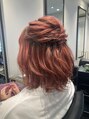 ボブスタイルのハーフアップスタイル。トップの編み込み、巻き下ろしの波ウェーブが可愛いスタイル。髪が短い方もぜひご相談ください。