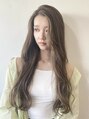 毛先をパツンとカットしたロングヘア。スリークに見えるようしっかり間引き。顔まわりは顎ラインで設定。動きが出やすいようにレイヤーを入れる。カラーは全体に細めのハイライトを入れ、明るめのオリーブベージュを重ねて重めスタイルでも軽やかな印象に。