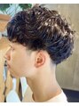 両サイドにツーブロック、後ろはエッジの聞いた刈り上げが入っております。全体に大きめのカールを強めに当てたパーマスタイルを施してます。