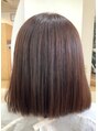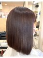 前下がりのミディアムボブ。外ハネアレンジ可能なパッツンボブ。縮毛矯正ストレートで全体の広がりやクセを整え、ツヤのあるなめらかな仕上がりに。9トーン・ラズベリーレッドブラウンカラーで派手過ぎないレッド系に。