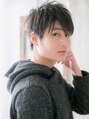 トップを立ち上げてスタイルアップ効果を狙った、アシンメトリーな無造作ショート。斜めバングで目元を印象付けてセクシーに。爽やかな黒髪サイドパートはビジカジスタイルにもピッタリ。
