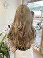 ブリーチでしっかり色素を抜いて、紫とほんのりピンクを少量含ませたベージュをオン。黄味を抑えて、濁りの少ないホワイトベージュに。ウェーブロングで圧倒的な存在感をプラス。