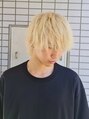 2回ブリーチをした後に薄いシルバーを混ぜたブロンドをオンカラー。目にかかるくらいの長さに残したラフな前髪のウルフスタイル。