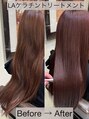 クセが気になるけど、透明感があるカラーがしたい人に向け「ストレートヘア+透明感カラー」を手に入れたい方にオススメです。縮毛矯正ではなく、ケラチンタンパクの効果でツヤツヤでふわっと自然なストレートヘアになれる薬剤と技術です。