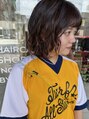 ボブウルフにしっかりカールのパーマスタイル。前髪はゆるっとワンカールでナチュラルに巻いています。バームとオイルでツヤっぽくしっかりめにスタイリングするのが可愛いです。
