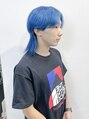ブリーチ2~3回 オーシャンブルーカラーでブリーチのベースが綺麗に抜けていれば水色っぽく色落ちしていきます。襟足長めセンターパートウルフスタイルは襟足とトップの長さのコントラストが効いたスタイルです。個性派ウルフにしたい方オススメです