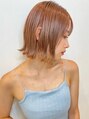 切りっぱなしボブの外ハネスタイル。カットは切りっぱなしでカットします。パーマで外ハネさせて、カラーはブリーチ後にオレンジシルキーベージュでオンカラーで完成。