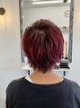 2ヶ月前のブリーチカラーが伸びて根元が黒くなったのを活かして、毛先を赤に。カットは所々ぶつ切りの短い毛束を作っています