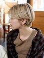 あえて曖昧な分け目でナチュラルなセンターパートショート。ハイトーンのミルクティーベージュで透明感をだしています。ニュアンスカールで柔らかい動きをだす。