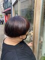 マッシュショート、後々ミニボブなどにも変化がつけられる、モードなスタイルです。衿足はギリギリ短くしてベースのマッシュラインをしっかり作ります。表面のみに、スライシングでブリーチしレッドブラウンをのせて、立体感をだしてます。