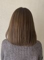 肩に付く長さのぱっつんボブ。透明感がでるグレージュカラーにしてるので、重く見えないように仕上げています。