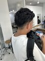 メンズカジュアルツーブロックスタイル。サイドとバックをスッキリ刈り上げ、トップはクセを活かしてオールバックにセット。