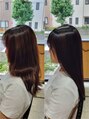 20代大学生のお客様でジワジワと人気の兆しのアジアンビューティーの黒髪へのチェンジ!しかも髪質改善酸性ストレートにて内部補修しながらの縮毛矯正で傷ませないヘアカラーの併用!ノンブローで、ただ乾かしただけのアフター写真(右側)です!