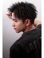 前髪を立ち上げたアップバングで爽やかさを出しつつ、ソフトツイストパーマで遊びも加えたスタイル。