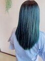 人気のダークブルーをベースにターコイズカラーをプラスしました♪※ベースの明るさ13レベル以上もしくはブリーチ一回以上あると再現しやすくなります。