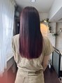顔周りのみレイヤーが入ってるロングスタイル。毛先はブリーチヘア。根元中間はノーブリーチのレッド。
