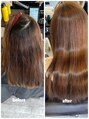 白髪染めで暗くなるのが嫌でブリーチでハイライトカラーをいれてる事前状態。2回入れたらしく毛先ハダメージが蓄積されてます。他店では矯正お断わりされ、グーグルでブリーチ縮毛矯正調べて来店。酸性縮毛矯正なら対応可能な髪