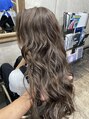 全体に細めにケアブリーチでハイライトを入れて、ハイライト以外はやや紫みのあるグレージュでカラー○ハイライト部分は、少し黄色みを消すぐらいで、コントラストがしっかりしているカラーです!