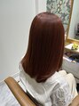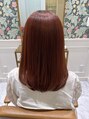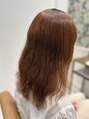 パーマがゆるく残っているヘア。髪を伸ばしているため、なるべく髪に負担をかけたくないので、ストレートはせず髪質改善トリートメントとイノアカラーでメンテナンス。色白のお肌をさらに引き立てるオレンジブラウンに。