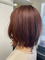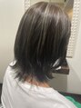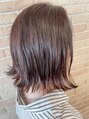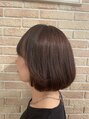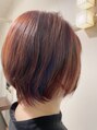 襟足ギリギリのショートヘアです。トップに丸みが出るようにカットしました。カラーはスカイブルーで少しピンクみが入っている色味になります。