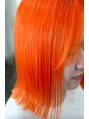 カットラインを残した長めなボブにベースカット。オリジナルのケア剤をたっぷり使用しブリーチ2回でベースを作り、ハイトーンビビットなオレンジでオンカラー。