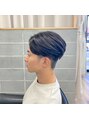 前下がりのセンターパートにカルマパーマをかけて分け目をつけやすく綺麗な毛流れに!ウエイトをあえて高めに設定することによって男性的なハンサムショートスタイルにしました。