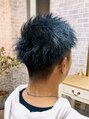アップバングのツーブロックです。方サイドに、ラインを入れてます。トップは、ある程度、遊びの動きが出せる長さに設定。ブリーチを2回した後、『ブルーと、アッシュ色の混色』を、カラーON。毛束のある動きと抜け感色のあるエッジな雰囲気ヘアになります。