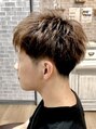 ショートマッシュのツーブロックです。トップに長短のレイヤーを入れ、束感を出してます!前髪は、センター部分をやや短く斜めにスライドカットを入れてるので、上げ下げどちらでもOK◎ヘアカラーは、「ブラウンベージュ色」です。