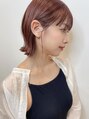 切りっぱなしボブの外ハネスタイル。カットは切りっぱなしでカットします。パーマで外ハネさせて、カラーはブリーチ後にワインレッドでオンカラーして完成。