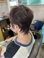 少し長めに残したもみあげと襟足にざくざくとした感じを出すためにしっかりと毛量調整をしました!トップはふんわりとするよう、短めにカットしています。