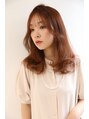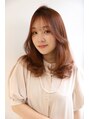 柔らかい質感のナチュラルミディアムヘア。ピンクベージュで大人可愛い印象に。顔まわりにレイヤーを入れた部分は軽くアイロンでワンカールに巻き、メリハリのあるヘアスタイルに。