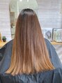 全体に低めのレイヤーをいれ軽さをだし、顔周りもしばった時にかわいいように。カラーはオリーブブラウンで赤みを消してます!