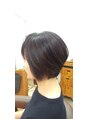前髪はアシンメトリー 前下がりのグラボブにレイヤーを入れ後頭部にボリュームと襟足スッキリにしました。 香草カラーのダークブラウンで染めました。
