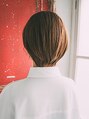 可愛らしいショートボブは顔まわりの毛を少し耳にかけ、襟足はタイトにカットにすることで大人な雰囲気に。カラーリングは赤みを抑えた明るすぎず暗すぎないナチュラルなグレージュカラー。 前髪をサイドに流して柔らかい印象に。