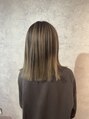 切りっぱなしの形にバレイヤージュをして単純な形に上品な綺麗さをプラスしております色がベージュ系で入れる事で色落ちしても汚い退色になりづらいのがポイントです