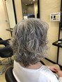 グレーヘアーを生かしたレイヤースタイル。 縦長シルエットに。