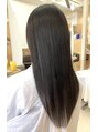 鎖骨下25cmのロングレイヤー。毛量調整でドライしやすい軽さに。フェースラインはリップラインの前下がり姫カット。シースルーバングでメリハリを。