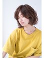肩の上のレングスのボブスタイルを、中間から毛先にかけてカールを加えてカジュアルダウンさせました。分けて目尻の長さの前髪もアンニュイな印象です。
