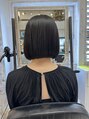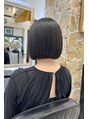 パツっとしたミニボブです。Xトリートメントで活性ケラチンやタンニンが髪のツヤを倍増しています。収まりも長期にわたって続きます!カラーはブルーブラックで赤みを消しています。