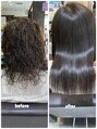 根本からウネリの強いクセ毛で広がってしまいまとまらない状態。髪はご年齢を重ねてカラーリングの影響もあり弱くデリケートな素材です。以前はアルカリ矯正で痛んでペチャンコがトラウマで矯正をやめてた。酸性矯正ならではの柔らかさと艶感でご満足。