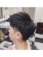 サイドは短めに刈り上げ風ツーブロックにし、ネープはハサミでナチュラルかつすっきりと刈り上げトップは扱いやすい長さと量に調整し、アップバングにセットしやすくカット