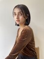 すとんとしたシルエットにシースルー前髪が大人っぽい印象のボブスタイル。黄色くしない艶っぽいブラウンカラーとおもためな質感が可愛いです。前髪にはつまんでオイルをつけて、細く見えるようにスタイリングしています。