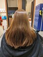 オーダーの第一声は「透明感!」とのこと。秋冬仕様にしたいということもあり、オリーブベージュでトーンダウンをしました。黄色味が強かったので、紫で消して、青みでトーンを補正。オリーブはほんのりにしてベースはベージュです。