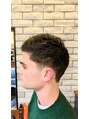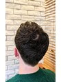 やや強めのカール毛で、膨らみが気になるとのこと。サイドは馴染むくらいのツーブロック、ネープは刈り上げないギリギリの長さにして、スソ周りのうねりを解消。トップは、髪の毛の間に空間をつくって動きがでやすいようにカット。