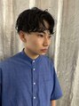 スパイラルパーマをセンターパートで仕上げるユニセックスなスタイルSTEP BONE CUTの骨格補正で耳にかけても扱いやすく後頭部のシルエットはコンパクトな仕上がりに。