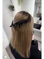 半年間にブリーチ縮毛矯正をしてからブリーチを2回されているお疲れ様。髪が伸びて根元にクセがでてまとまらないのがお悩み。今回は根元のクセを伸ばして毛先は毛髪強化をして綺麗な髪にしていきます。